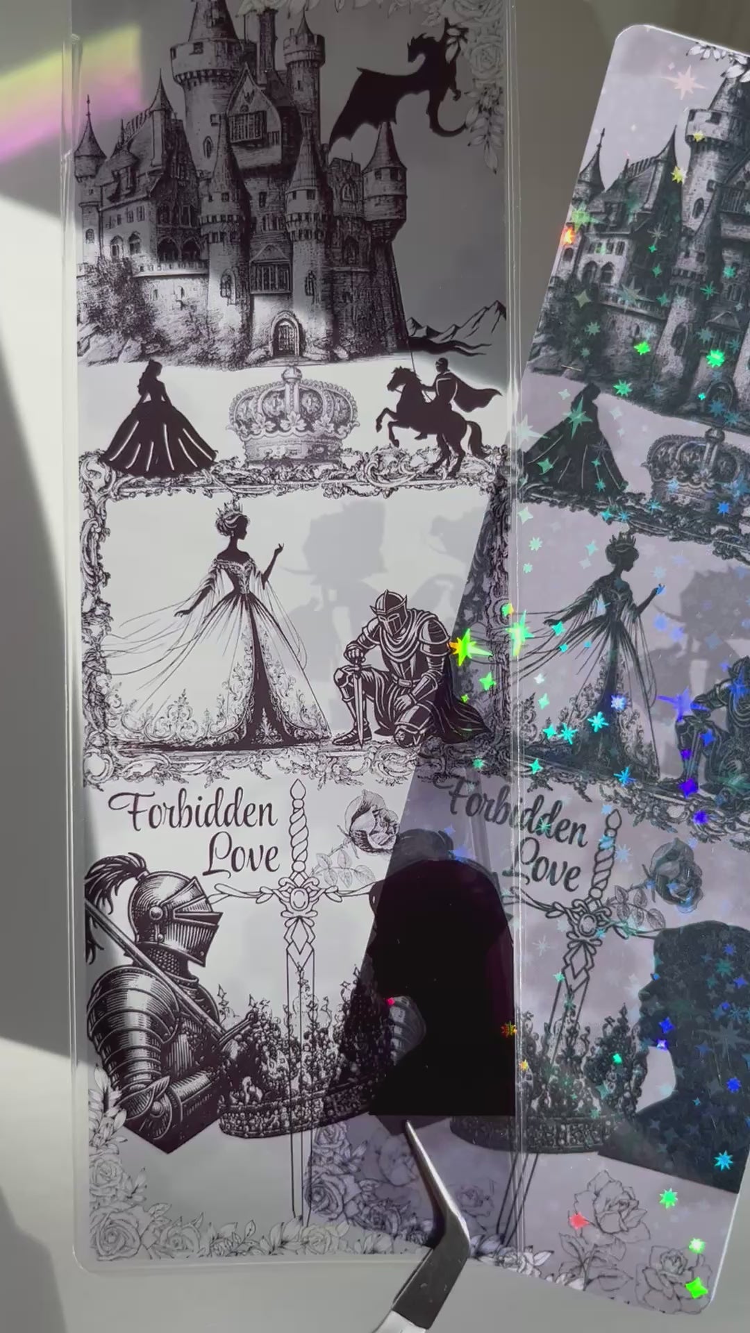 These bookmarks are perfect for fantasy lovers! They will come in a set of two, one clear and one holographic. They are 6.6in in length and 2.2in in width.